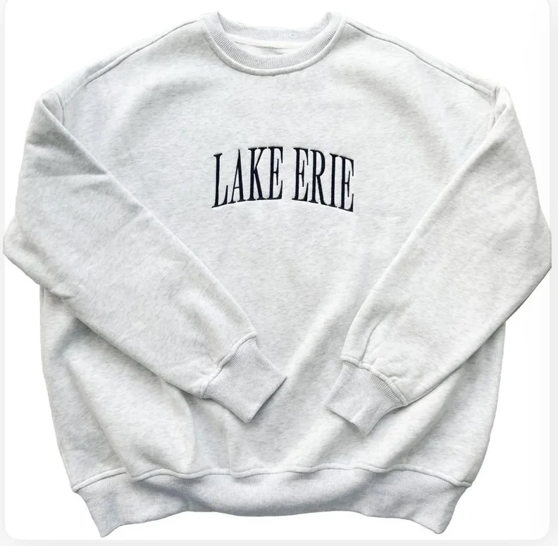 Gray Unisex Crewnecks with “Lake Michigan” embroidery in navy.